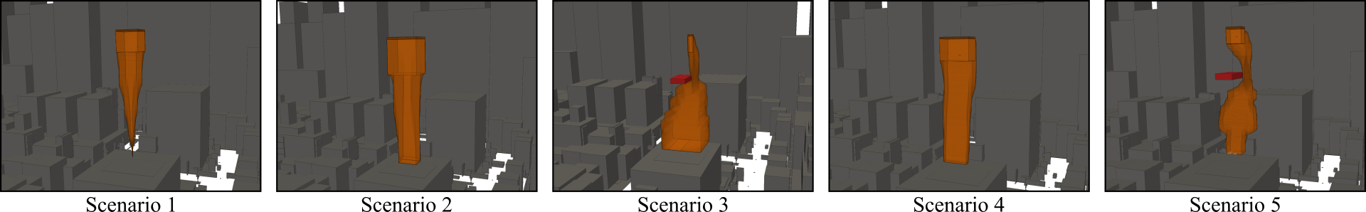 - Scenario 2. The exact landing target is unknown, and only an approximate target point is provided. This point is sampled from a normal distribution centered on the helipad located on the rooftop.